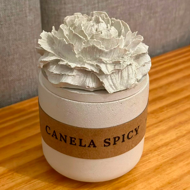 O vaso, feito artesanalmente em cimento, confere textura, peso e elegância rústica, harmonizando o contraste entre o bruto e o refinado. A tampa escultural em formato de flor acrescenta um detalhe artístico que faz dessa vela uma verdadeira peça de decoração — ideal para compor mesas, estantes ou ambientes de relaxamento.