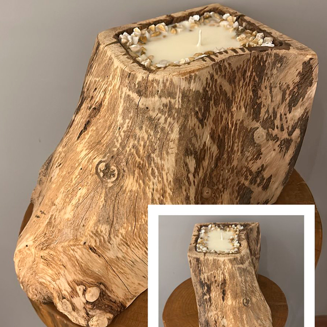 O vaso, esculpido em madeira bruta, revela as texturas únicas do tempo, enquanto o acabamento com pedras de rio naturais adiciona um toque de serenidade e harmonia à composição. Cada vela é artesanal e única, valorizando a imperfeição natural e o encanto do feito à mão.