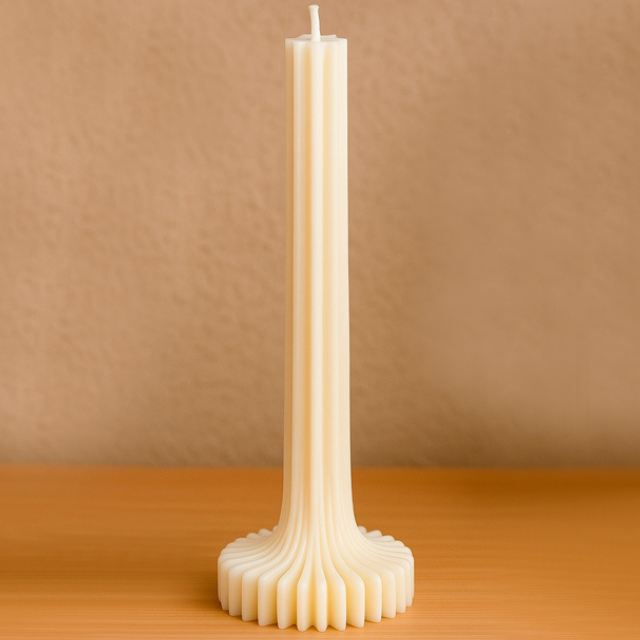 Imponente, delicada e cheia de presença, a Vela "Coluna" é uma peça que une design moderno com inspiração clássica. Seu corpo alto e esguio é sustentado por uma base escultural com textura ondulada, lembrando formas arquitetônicas e esculturas contemporâneas.