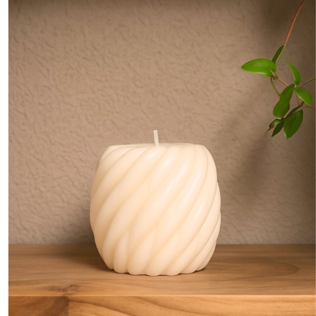 Elegante e envolvente, a Vela "Helena" (tamanho médio) traz o charme do movimento em sua forma espiralada. Suas curvas contínuas criam uma textura delicada que transforma a luz em um espetáculo visual de sombras suaves e brilho sutil.